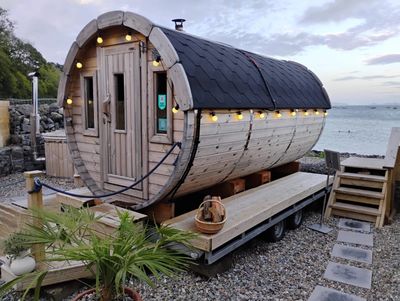 The sauna itself started life down in South Wales with Barrel Sauna UK, making sure that our sauna was made here in Wales was always a priority. Our first location was a tiny patch of land on the way into Beaumaris over looking the Menai Strait and the mountains of Snowdonia / Eryri National Park. Our site consisted of the sauna, a couple of footbaths and a wind breaker. We then custom made our cold plunge tank along with all our beautiful decking. However it was always our intention to change location so in April 2025 we moved a few hundred yards to the beach on the opposite side, with an equally fantastic view and still a 30 second walk to the water at high tide but now with a full site with fencing, free parking, somewhere for our team to sit, lots more decking and seating AND a wood fired hot tub!